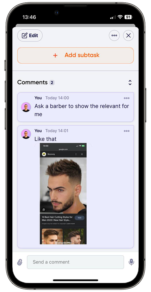 👉 Comments / Messages: users can attach to a task Photo, Video, Audio, Files, Reactions, Reply, Emoji, Edit and delete. We did fully custom UI of the Comment screen, but we use Getstream as provider.